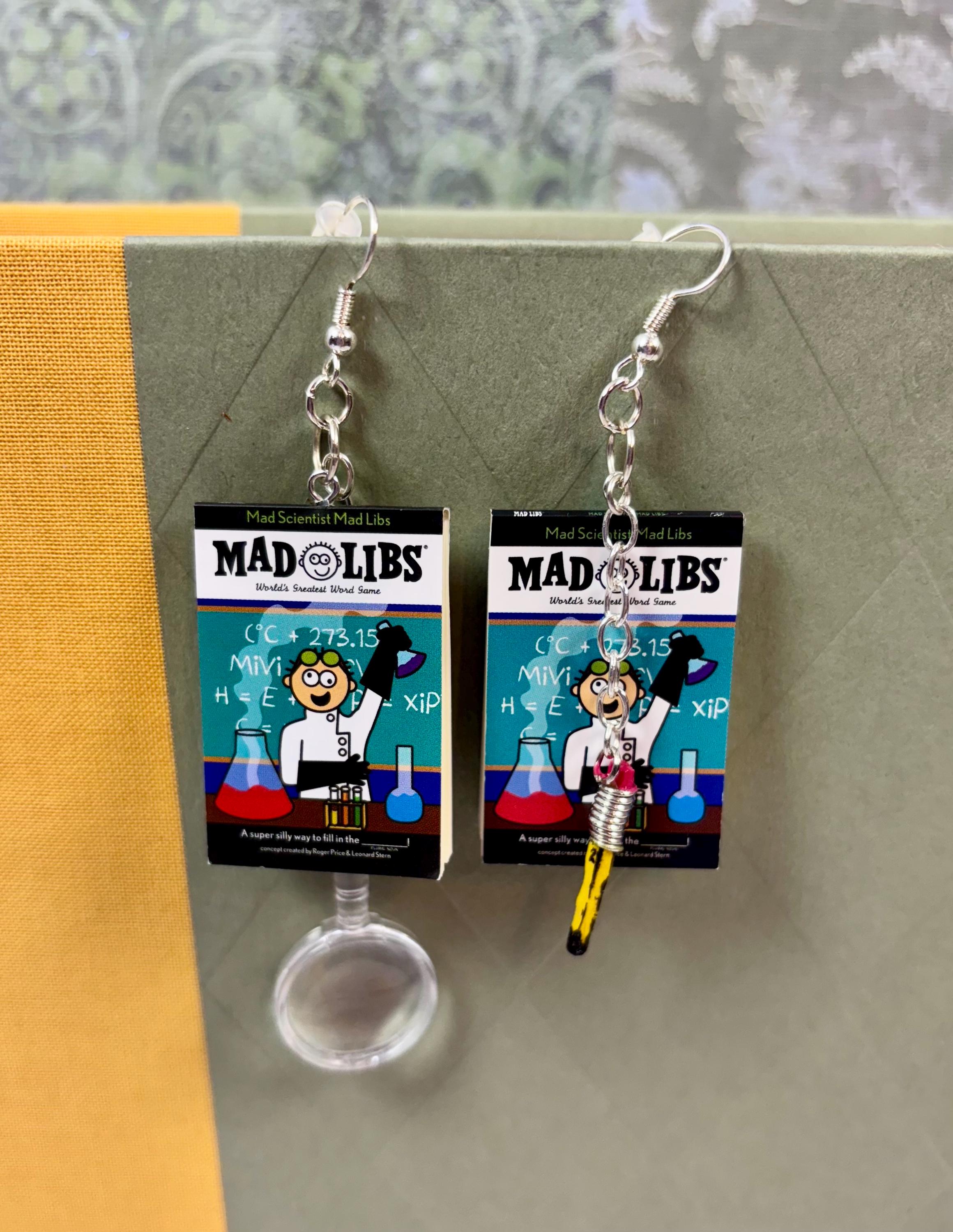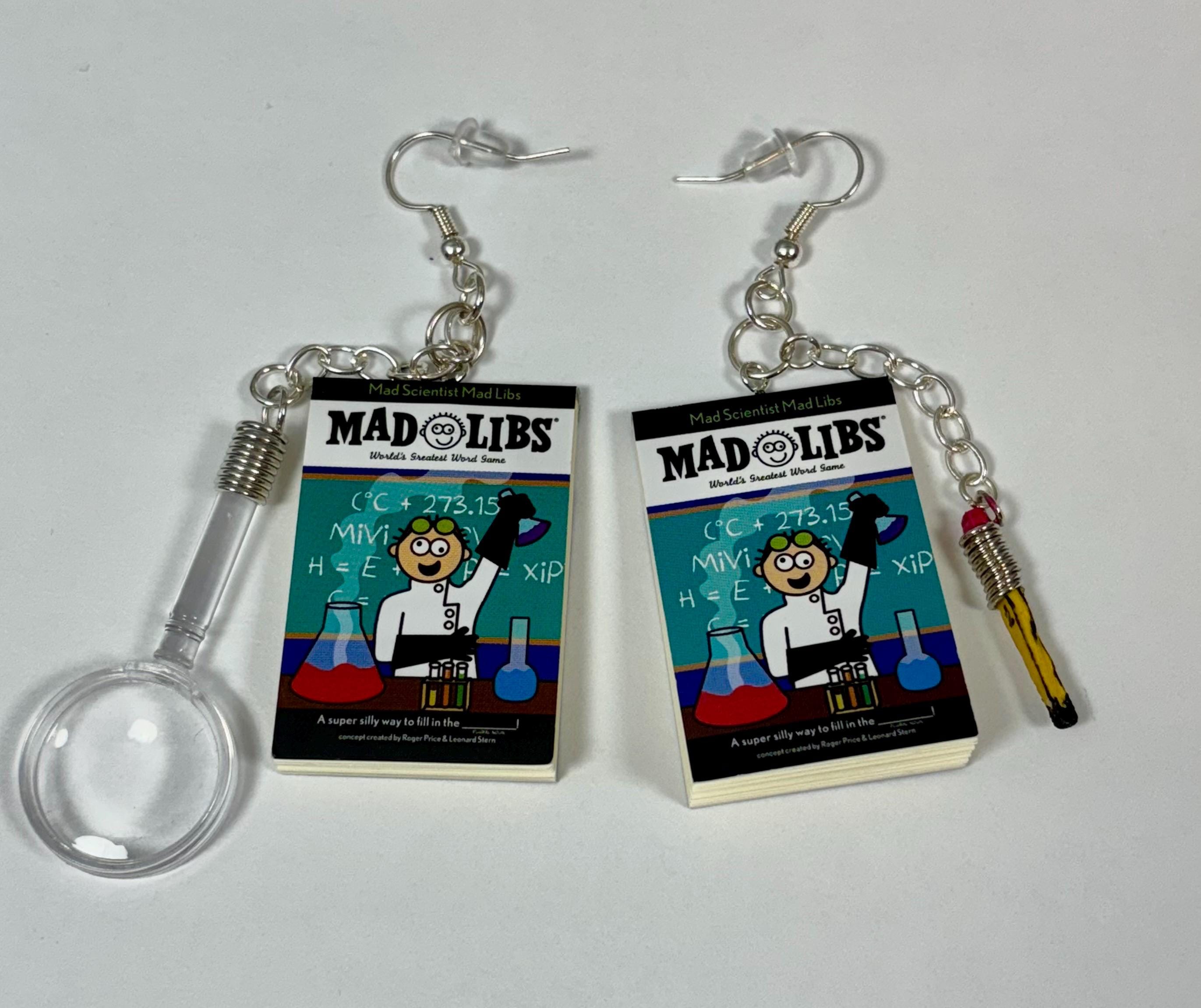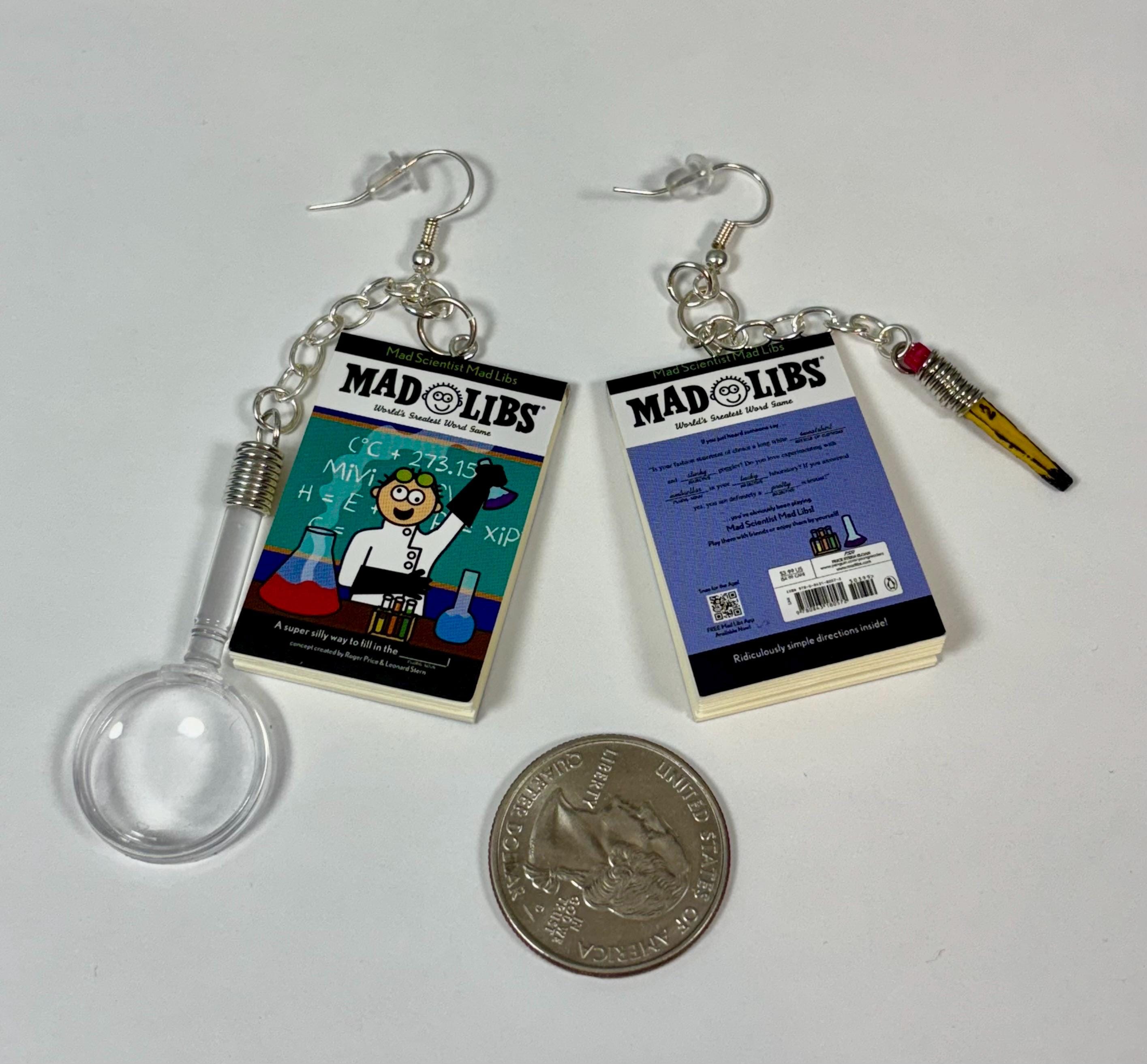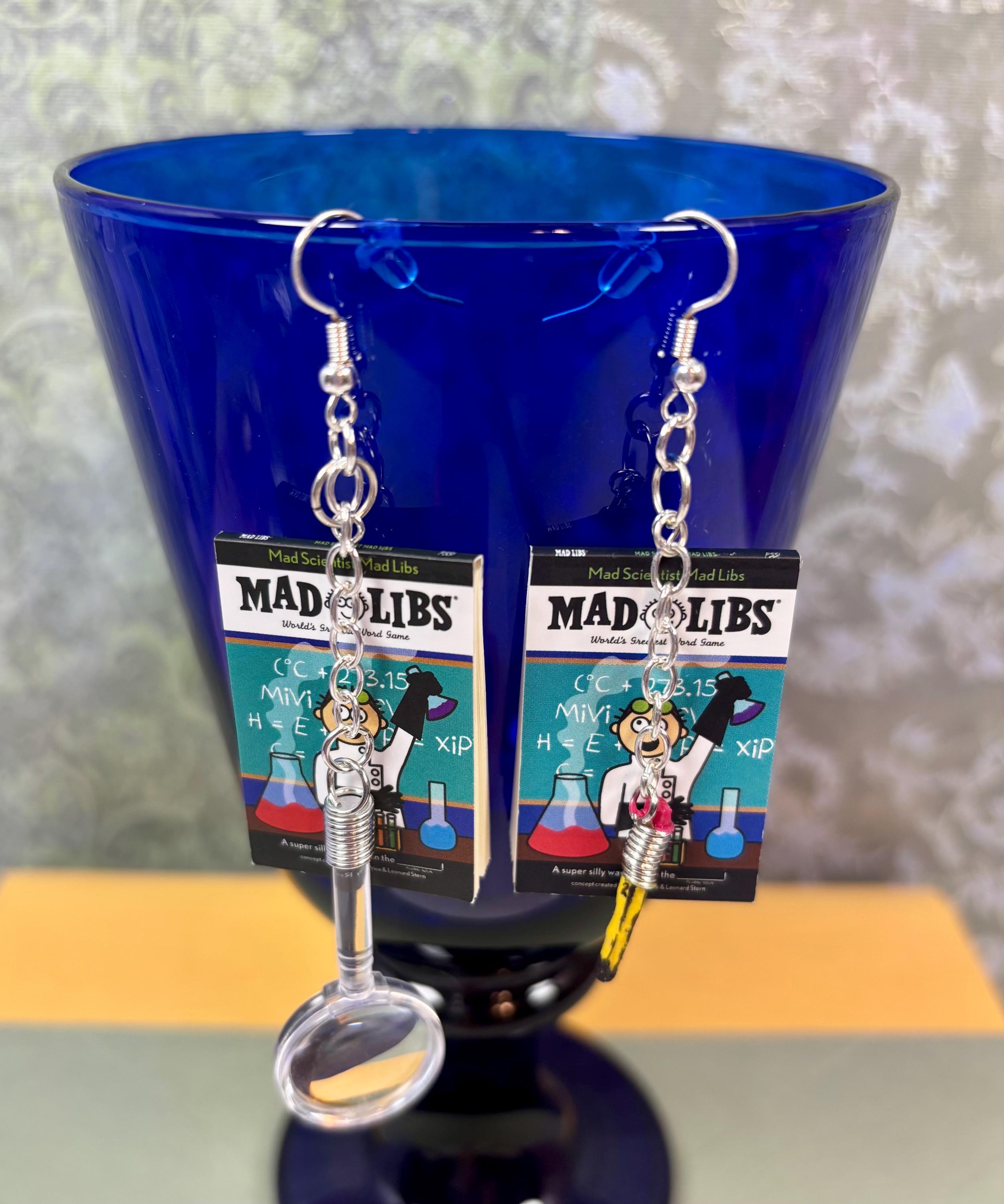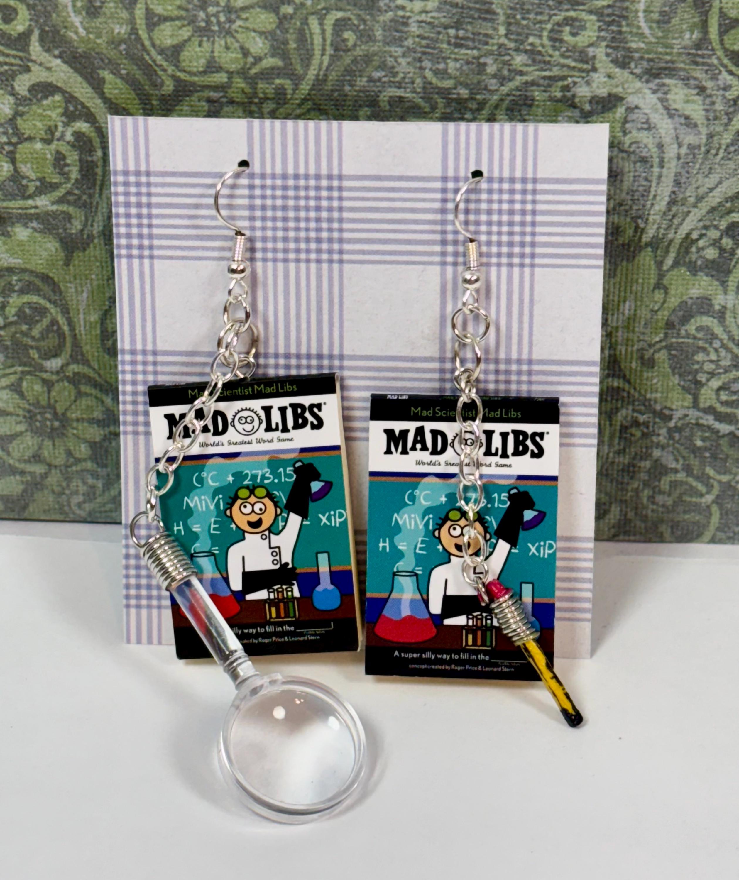 Mini books, “Mad Libs”, made into earrings. Includes the plastic magnifying glass on one and a tiny hand painted pencil on the other, both hanging from an attached silver chain.